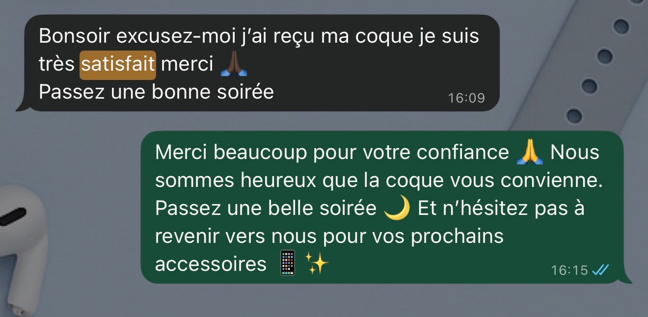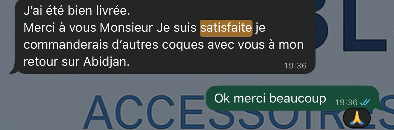 J’ai été bien livrée. Merci à vous Monsieur, je suis satisfaite. Je commanderai d’autres coques à mon retour sur Abidjan.”